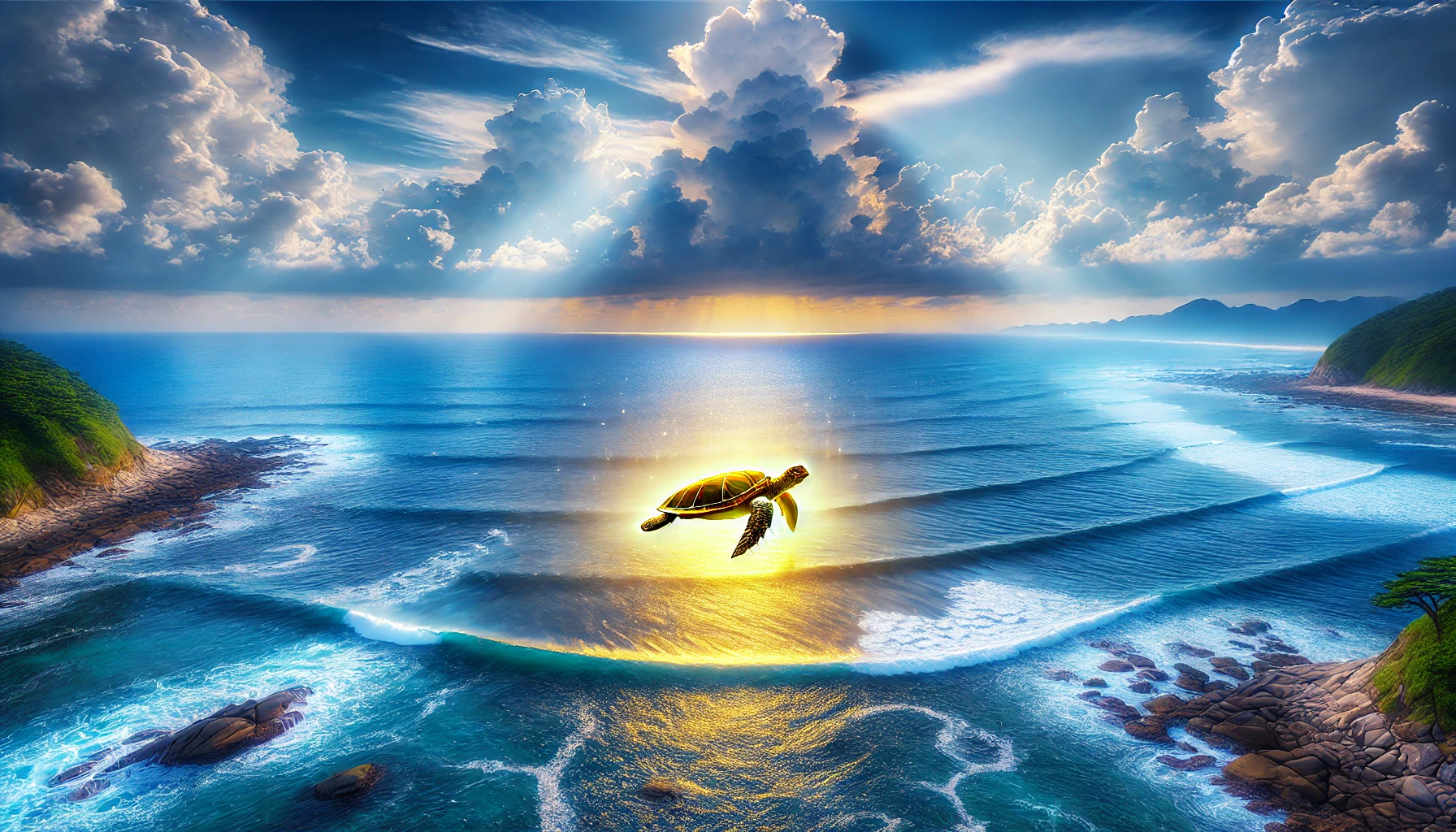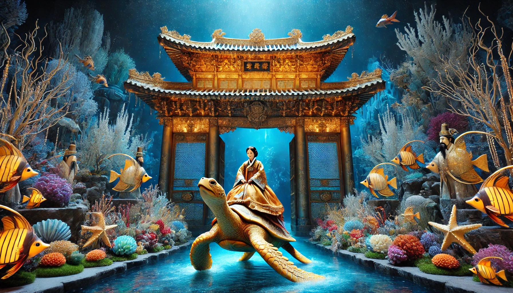 그러자, 눈 앞에 끝없이 푸른 바다가 펼쳐지는데 저 수평선 끝에서 황금빛을 발하는 거대한 거북이가 다가온다. 참으로 찬란하고 신비로운 광경이다. 그리고 신할머니가 거북이를 올라타고 마침내 용궁으로 들어갔다.
