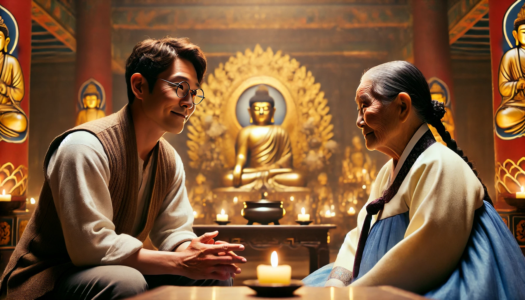 할머니가 놀란 듯한 표정으로 눈이 번쩍 뜨이며 흥분한 듯 말한다.