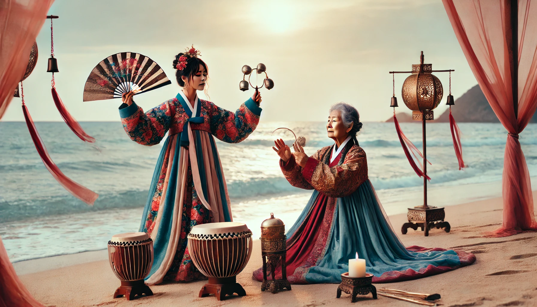 젊은 여자가 신할머니가 오셔서 신병으로 아프고 바닷가를 찾다.