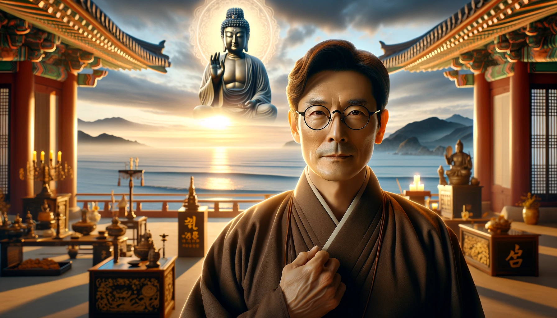 수인을 하고 <관세음보살 육자대명왕진언>읊어주니 눈앞에 파란 바다의 끝에 눈부신 태양이 반쯤 걸치며 올라온다. 그러면서 이 장면 속에서 부처님이 허공에 꽉 차 있는 모습을 보여준다.