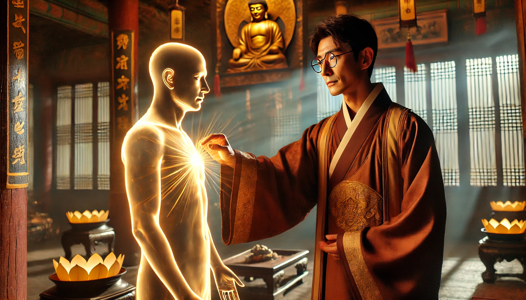 그리고 광명진언을 외며 아뇩다라삼먁삼보리의 빛덩어리를 손에 쥐고 그 귀신 몸속으로 쑥 집어넣었다.