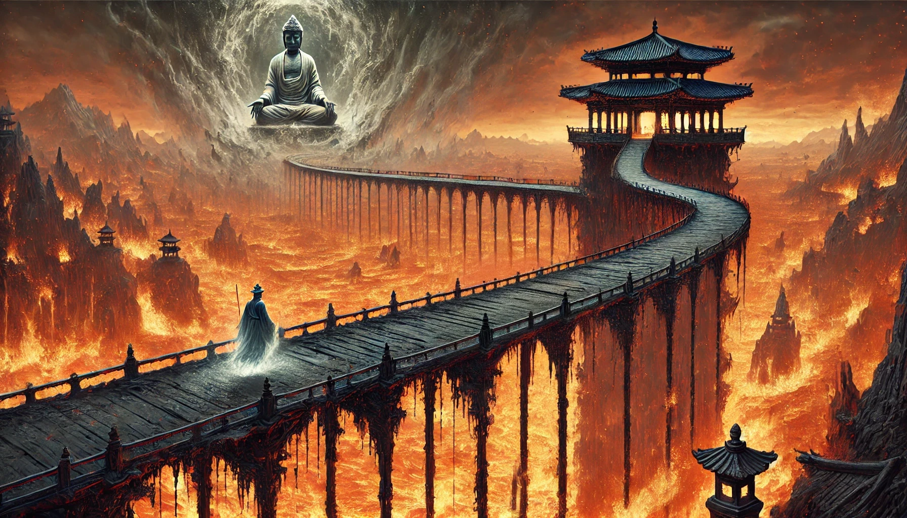 "아니, 어쩌지, 내가 불지옥 저 너머에서 불지옥을 건너서 여기에 오는 다리가 무너졌으니 돌아갈 수가 없어, 어쩌지..."