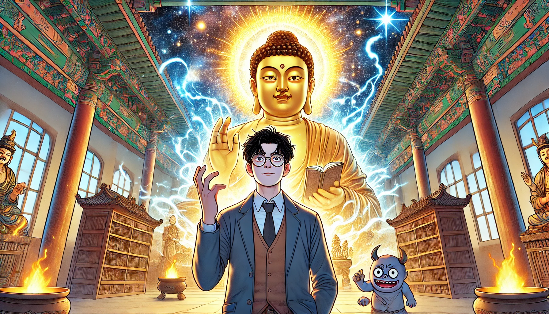 악마가 눈을 뗄 수 없을 정도로 우주 전체의 모습으로 광명을 찬란하게 발하고 있는 그 용왕대신의 몸을 보니 이 지구의 어떤 악마도 두려움에 떨 수밖에 없다.